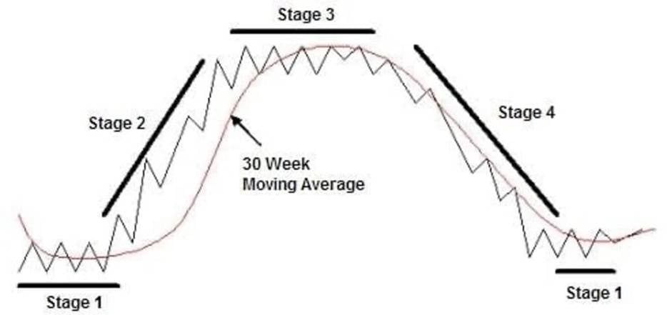 You see, at any given point in time, a stock is in one of four unique stages: 1) going sideways at a bottom, 2) going up, 3) going sideways at a top, or 4) going down.